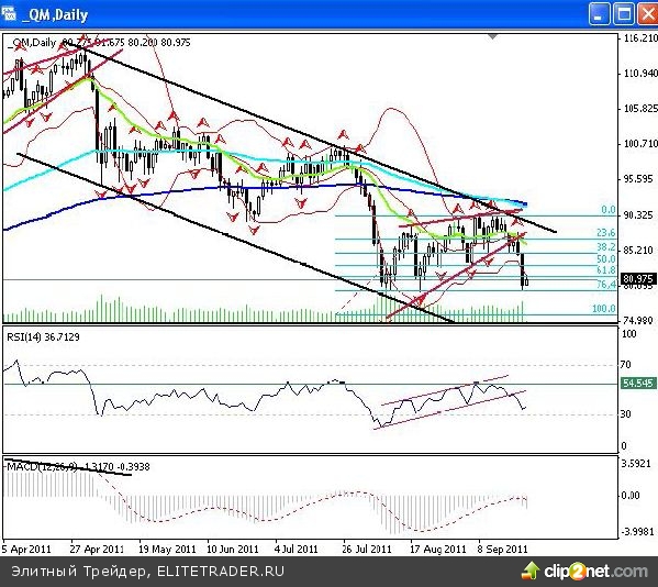 РЫНОК НЕФТИ Глядя на дневной график нефти марки Light все понятно и без слов. Как я и ожидала фигура «медвежий клин» была прорвана вниз, цены на нефть только за вчерашний день просели до уровня 79,5-80$ за баррель, потеряв более 5%. Следом были пробиты еще два подряд идущих дневных фрактала на продажу: 83,125$ и 82,875$, день был закрыт ниже 61,8% уровня коррекции, что это значит, я повторять уже не буду. Моей будущей целью снижения выступает район 70-75$ за баррель.