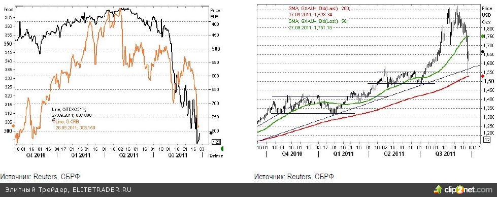 Рисунок слева: Прочь от рисков! Желтым - CRB Reuters All Commodities, черным - перевернутый iTRAXX XOVER. Одной из новостей выходных было то, что почти все рынки мира оказались в медвежьей зоне. Что может спасти их оттуда? Рисунок справа: Попытка справиться со спекуляциями в золоте: CME подняла размер маржинального депозита по золоту на 21%, серебру (да, опять) - 16%, меди - на 18%. Зачем, ведь золото не нефть? Видимо, дело в активных спекуляциях с производными на его основе. Объем всего физ.рынка золота, как мы писали - всего 2.5 трлн.долл. Этого очень мало при такой популярности. Плюс снижению способствовали проблемы с ликвидностью. Малейшее изменение ситуации - и рост возобновляется.
