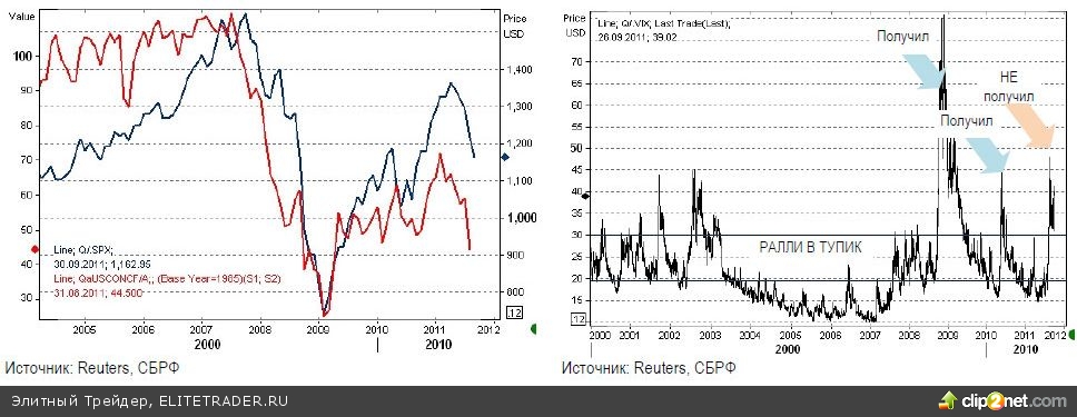 Рисунок слева: Вот где нормальная логика, корреляции восстановили статус кво в последние недели! Красным - индекс потребительского доверия, синим - S&P500. Рисунок справа: Рынок страждал QE3, но не получил его на этот раз - на примере индекса VIX:
