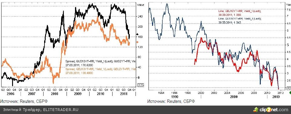 Рисунок слева: Наклон кривых в США (черным) и Европе (желтым). Наклон снижается, но далек от предрецессионной плоскости 2006-2007 г. Сейчас спрэд 10y2y составляет для случая США около 150 б.п. При достижении цели - снижения YTM 10-леток на 50 б.п., т.е при доходности около 1.5% кривая может сохранить еще некоторый наклон: в 2007 г. она была инверсной. На самом деле, инверсия кривой - даже при нулевой Fed target - не представляется в текущих условиях чем-то невероятным. Случись такое - и вот вам готовая ловушка ликвидности... №22! Рисунок справа: Доходности 10-леток США (синим) и Bunds (красным) на долгосрочном горизонте. Таких значений, как сегодня и которые ФРС надеется снизить еще больше, просто никогда не было. А.Гринспен сделал, что мог: многолетний кредитный цикл даже после смерти требует продолжения снижения ставок.