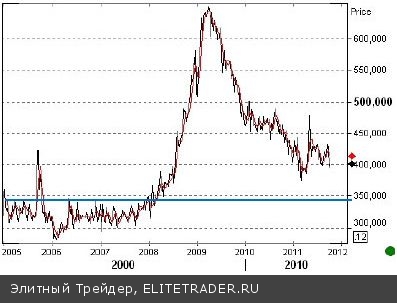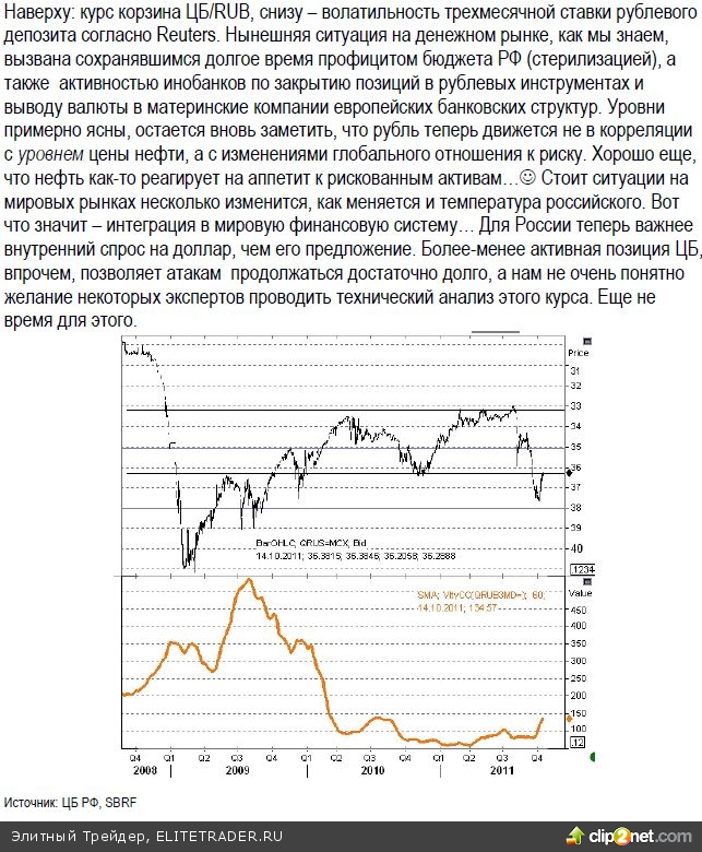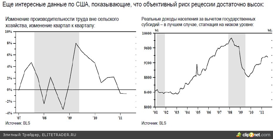 В нынешнем искаженном состояния рынка трудно оценивать ситуацию, исходя из обычной логики. Много индикаторов указывает на экономический спад. Однако каждая серьезная порция негативных новостей вызывает к жизни новые ожидания QE, а опыт последних двух лет весьма убедителен: QE действенны. Несмотря на более чем скромные по сравнению с масштабом антикризисных мер результаты, рынки получают искомые несколько кварталов роста. Разумеется, чем дальше, тем труднее этот рост поддерживать с течением времени, и история QE2 для этого - хороший пример. Надежды относительно ЕС связаны только и исключительно с объемами денег, направляемых на новые выкупы, но не судьбой реальной экономики PIIGS, и это более чем показательно. Таким образом, никаких оснований ожидать снижения волатильности на сегодня нет. Снижения рисков, несмотря на кое-какие позитивные (преходящие) данные по США и ЕС, объективно также не наблюдается.