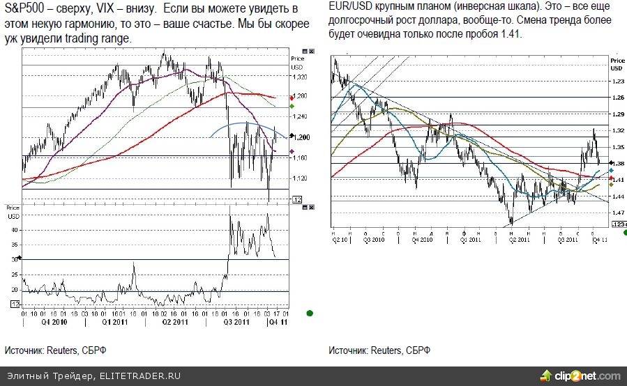 Белый шум из Европы продолжает бодрить рынки. "Меркози" заявили, что долговой кризис в Европе будет разрешен до конца месяца. Столь громкое заявление, разумеется, относится к текущим проблемам, а не к основам кризиса. Как всегда, никаких деталей... и, как всегда, разногласия остаются: Меркель считает, что европейские банки должны рекапитализироваться прежде всего за счет частных инвесторов, Саркози - за счет ЕР8Р.