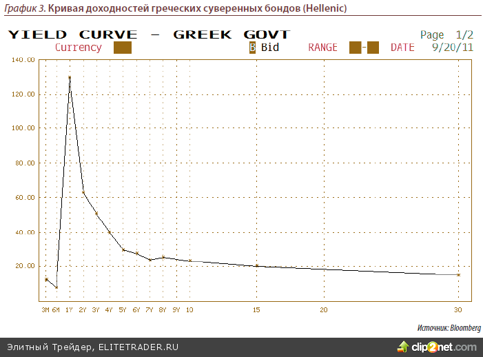 Ещё более драматические события разворачивались в истекшем квартале на рын- ке «страховок от дефолта» Греции (CDS’ов) – см. График 4. Только за один месяц, с 20 августа по 20 сентября их стоимость увеличилась практически вдвое, а для кра- ткосрочного долга – фактически утроилась. Яркие речи и заверения принципиаль- ной невозможности дезинтеграции стран-участниц еврозоны, неустанно звучащие из уст европейских политиков – в частности председателя Еврогруппы Жана-Клода Юнкера, канцлера ФРГ Ангелы Меркель и президента Франции Николя Саркози – с течением времени выглядят всё менее убедительными – даже на фоне расшире- ния полномочий пресловутого «механизма перманентной стабильности евро» - пре- тенциозно названного коллективного фонда, чья роль в последнее время всё больше и больше сводится к помощи ЕЦБ в банальном выкупе с рынка проблемных облига- ций европейских стран.