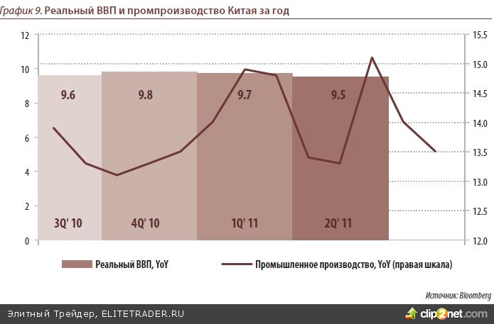 Интересно будет также взглянуть на выходящую статистику из Китая. Ближайшие данные выйдут 14 октября - по уровню инфляции (прогноз – рост годовой инфля- ции до 6,2%) и 18 октября - промышленное производство за сентябрь (прогноз - сни- жение темпов роста до 13%) и ВВП за 3 квартал (прогноз - снижение темпов роста до 9.3%).