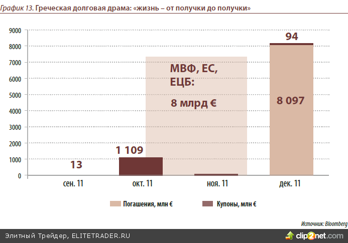 В начале 4 квартала некоторую поддержку рынкам может оказать сезон корпора- тивной отчетности в США и Европе (аналитики ждут от корпораций заметного ро- ста прибылей). Эконо¬мическая статистика США и Европы в 3 квартале продол- жала посылать тревожные сигналы и будет интересно посмотреть, как отдельные компании переживают возникающие в мировой экономике вызовы. В дальнейшем динамику рынков определят действия центробанков развитых стран (ФРС США и ЕЦБ) и события вокруг долгов периферийных стран Европы. Мы ожидаем, что в се- редине октября тройка ЕЦБ-МВФ-Еврокомиссия по итогам проводимой инспекции наконец выделит Греции шестой транш помощи в 8 млрд евро и стране удастся из- бежать технического дефолта. Выделение помощи принесёт на рынки волну позити- ва. Впрочем, есть риск, что Германия может отложить выделение помощи до нача- ла ноября(4-5 ноября в Каннах состоится саммит G20, на котором будут обсуждать- ся долговые проблемы стран Евросоюза) для обсуждения европейских проблем на мировом уровне.