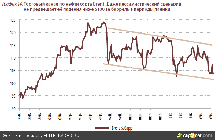 С технической точки зрения для нефти марки Brent уровень $100 является сильным уровнем поддержки, от которого в течение этого года она неоднократно отталкива- лась. Фундаментально же устойчивое снижение цен на нефть возможно только в ус- ловиях рецессии мировой экономики. В противном случае, если рост экономики бу- дет продолжаться, пусть и более медленными темпами, спрос на нефть, а вместе с этим и её цена, будет расти.
