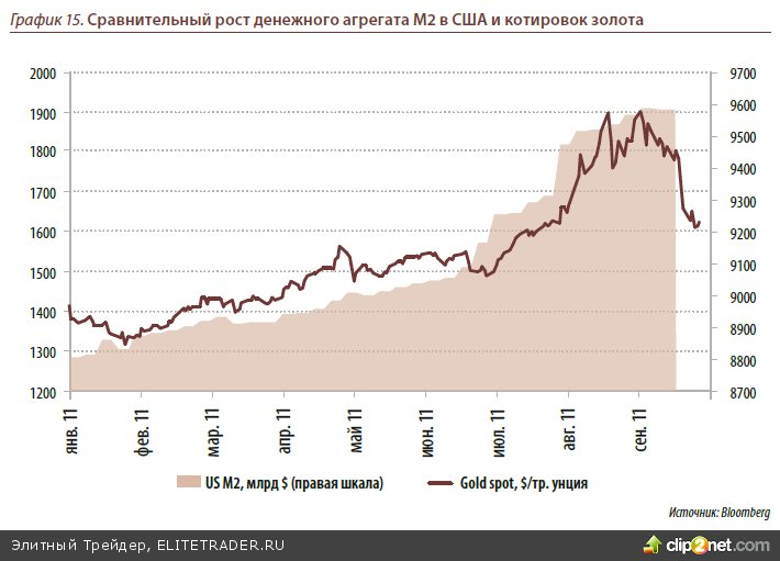 Как и прежде, мы вновь приводим в качестве нашей основной отправной точки те- зис о том, что котировки золота достаточно хорошо следуют за динамикой увеличе- ния долларовой массы (денежный агрегат М2). Как ни странно, золото практиче- ски инертно к увеличению М2 в зоне евро, поэтому, ввиду прекращения череды про- грамм «количественного смягчения» в США, замедление роста «жёлтого металла» выглядит вполне обоснованным.