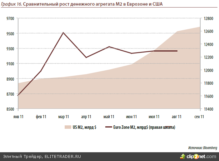 Мы разделяем мнение большинства умеренных пессимистов, что мировая экономика в 4-м квартале лишь немного «снизит обороты», но отнюдь не войдёт в фазу рецессии. Даже ненулевой риск дефолта Греции в конце нынешнего-начале будущего го- да вряд ли сможет запустить явные процессы экономического сжатия. Объективная сложность в принятии Федрезервом США решения о дополнительном раунде сти- мулирования американской экономики, которое в свете существенно ухудшивших- ся её параметров, являлось бы весьма логичным – и потому неизбежным – дей- ствием, наталкивается на сопротивление мировых держав – в первую очередь, круп- ных держателей американских долговых обязательств, а также, во всё большей мере, представителей финансового сектора самих США. Таким образом, основная неопре- делённость исходит совсем не из Европы и не от долговых рынков (современные пра- вительства по обе стороны океана используют одни и те же «приёмы», чтобы эффек- тивно тушить локальные вспышки «долговых пожаров», и нет причин сомневаться, что они вдруг разучатся это делать!), а от прогноза объёма денежной ликвидности на глобальных рынках.