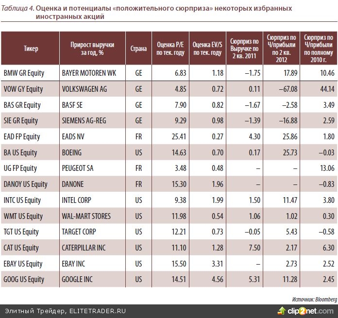 В приближающемся сезоне корпоративной отчётности в США и Еврозоне за 3-й квартал мы, как всегда, выделяем потенциалы акций компаний-«мультинационалов». На протяжении 2010-2011 гг. эти компании, а также представители сетевого ритей- ла, наиболее часто и впечатляюще преподносили позитивные сюрпризы по своей фи- нансовой отчётности (реальные показатели оказывались в той или иной мере вы- ше консенсус-оценки рынков). В нижеприведённой таблице мы выделили типичных представителей этих групп и отметили жирным шрифтом наиболее привлекательные с точки зрения инвестиционных мультипликаторов и потенциалов «преподне- сения позитивного сюрприза» компании
