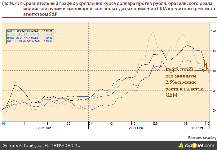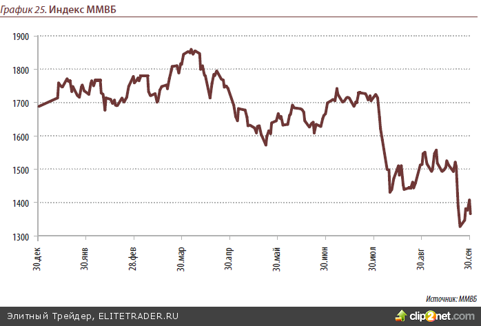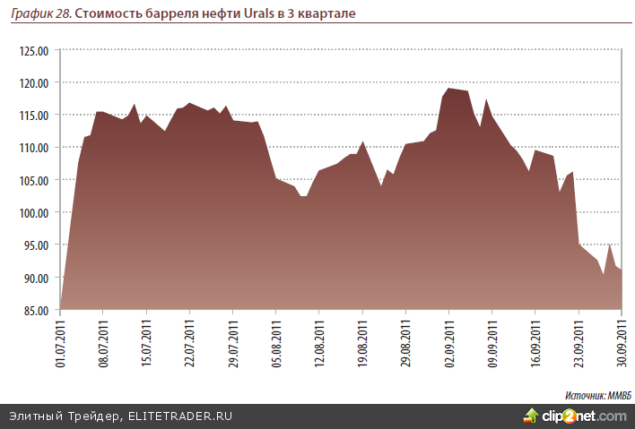 Всё это наряду с усугубляющимися долговыми проблемами стран Еврозоны способ- ствовало и падению цен на нефть, что в свою очередь, вкупе с оттоком капитала, при- вело к снижению рубля относительно доллара на 12.89% по итогам 3 квартала. При этом лишь за сентябрь падение составило 9.92%, тогда как нефть марки Brent за это время снизилась на 10.3%.