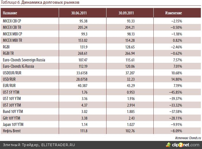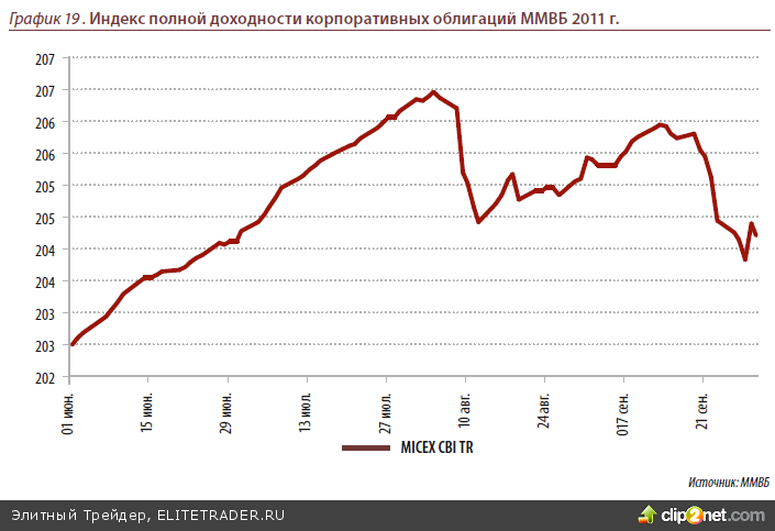 За прошедший квартал индекс полной доходности корпоративных облигаций MICEX CBI TR снизился на 0.69%. Чистые цены рублевых облигаций снизились в среднем на 2.07%, что подтолкнуло доходности вверх. На наш взгляд, в результате прошедшей коррекции, как в облигациях российских эмитентов, так и по рублю, существующие риски были чрезмерно отражены на нашем рынке и в течение 4-го квартала мож- но ожидать восстановления рынка рублевого долга. В то же время из-за продолжа- ющейся нестабильности в странах Еврозоны ситуация с массированными распро- дажами и значительным увеличением оттока капитала может повториться, поэто- му для инвесторов, которым нежелательно получить негативную переоценку в порт- фелях на ближайший квартал лучше продолжать держаться короткой дюрации до 1 года.