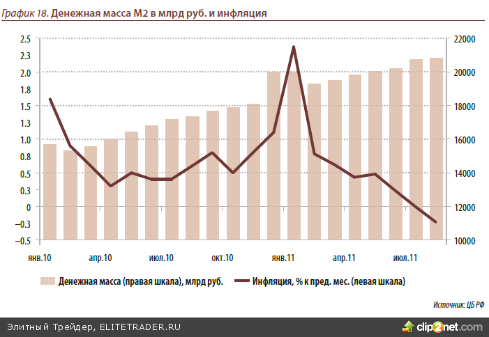 В течение 4-го квартала можно ожидать стабилизации на финансовых рынках, ес- ли в странах Еврозоны будут приняты важные решения, консенсус по которым по- ка не достигнут: выдача Греции очередного кредитного транша, расширение объема и полномочий фонда финансовой стабильности EFSF. Тем не менее, если мы уви- дим очередное бегство от рисков, то у Банка России и Минфина РФ есть до- статочно ресурсов для поддержки банковского сектора. При необходимости ЦБ РФ вполне может снизить ставку рефинансирования, а также исполь- зовать другие дополнительные инструменты для предоставления дополни- тельной ликвидности банкам в том объеме, в котором им потребуется, учитывая, что инфляция в течение квартала продолжала держаться около ну- ля. Отсутствию роста потребительских цен способствовало, как замедление темпов роста денежной массы относительно прошлого года, так и благо- приятные погодные условия, что привело к снижению стоимости продук- товой корзины. За первые 3 квартала прирост цен составил 4.7%, при плано- вом её значении на конец года в 7 – 8%. Можно ожидать, что по итогам года она окажется даже ниже запланированного значения и ближе к концу года вполне ве- роятно, что регулятор всё-таки понизит ставку рефинансирования. С другой сторо- ны, на внешних рынках и, в частности, в Еврозоне пока сохраняются высокие си- стемные риски. Это может отсрочить какие-либо изменения в денежно-кредитной политики ЦБ РФ