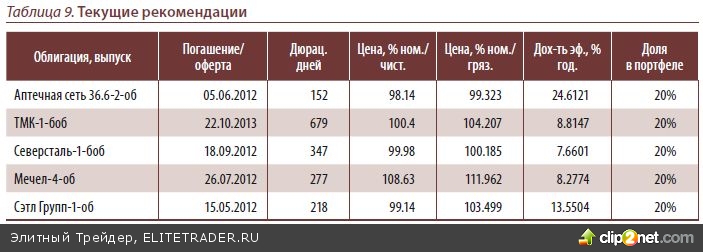 В случае реализации одного из негативных сценариев, таких как суверен- ный дефолт в Еврозоне или банкротство одного из крупных европейских банков, на мировых рынках в очередной раз повторится бегство в безопас- ные активы и отток капитала из развивающихся стран, что приведет к оче- редному ослаблению рубля и росту процентных ставок на российском рын- ке. Несмотря на то, что в базовом сценарии мы не предполагаем реализацию этих рисков в течение квартала, в текущих условиях рекомендуем не брать на себя до- полнительные риски и держаться преимущественно коротких выпусков. Подобной стратегии мы рекомендовали держаться в прошлом квартале, что позволило полу- чить прирост по портфелю на 0.58%, тогда как индекс полной доходности корпора- тивных облигаций MICEX CBI TR снизился на 0.55%. При этом, портфель был сфор- мирован целиком из облигаций 2-го эшелона, которые, на наш взгляд, на момент ре- комендации выглядели интересными с точки зрения соотношения доходности к их кредитному риску, что в итоге оказалось оправданным.