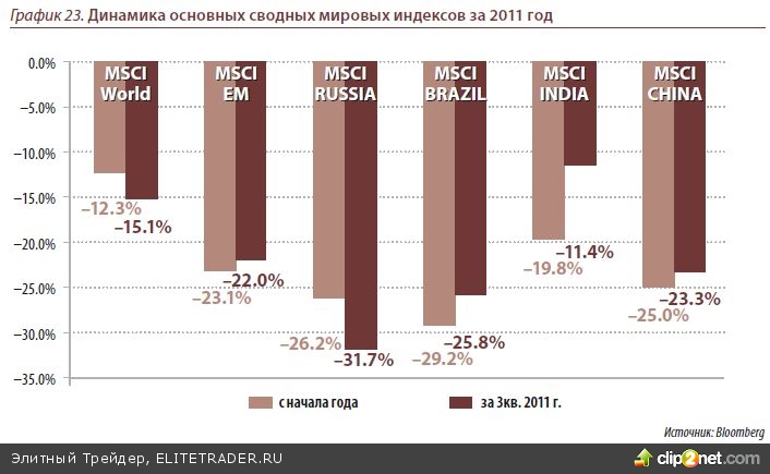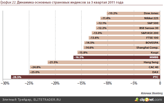 Заметно упали индексы развивающихся стран. В 3 квартале велись активные прода- жи на рынках стран BRIC – западные инвесторы поправляли свои балансы и сокра- щали “рисковые” позиции, вспомнив старое правило “Cash is king”. Глобальный ин- декс MSCI World, отражающий динамику мирового рынка акций, за третий квартал 2011 года снизился на 15.1%, тогда как индекс MSCI Emerging Markets за указанный пе- риод опустился на 22%. Наиболее от панических распродаж пострадали рынки MSCI China(-23.3%), MSCI Brazil (-25.8%) и MSCI Russia (-31.7%). Из страновых индексов наи- большие потери понесли китайский Hang Seng (-21.5%) и российские индексы ММВБ и РТС (-16.6% и -28.5% соответственно). Лучшая динамика индекса ММВБ объясняет- ся усилением доллара по отношению к рублю (индекс ММВБ рассчитывается в рублях, индекс РТС – в долларах). По этой же причине относительно неплохо смотрелся бра- зильский Bovespa, рассчитываемый в реалах(-14.6%).