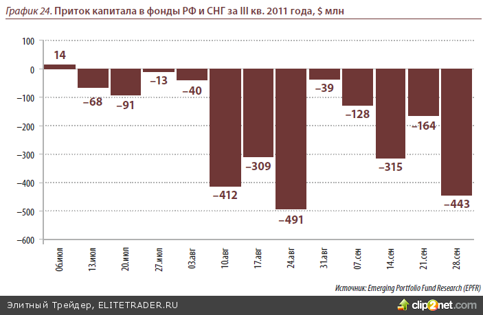 Настораживает сохраняющаяся тенденция вывода средств фондов с мировых рын- ков, по которой традиционно судят о настроениях инвесторов. По данным Emerging Portfolio Fund Research (EPFR), начиная с августа, наблюдается вывод средств. Наиболее активно деньги выводились из фондов, инвестирующих в развивающие- ся рынки (GEM) – с начала года эти фонды потеряли более $22 млрд. Фонды, инве- стирующие в Россию в 3 квартале оказались аутсайдерами. Начиная с июля вывод средств с российского рынка нерезидентами продолжался 13 недель подряд. За это время клиенты фондов вывели почти $2.5 млрд. Это самый продолжительный отток средств из российских фондов с ноября 2008 года. Исходя из уменьшения интереса к риску со стороны глобальный фондов, а также необходимости увеличения cash на балансах для многих европейских банков, в 4 квартале вывод средств фондами EPFR с российского рынка может продолжиться
