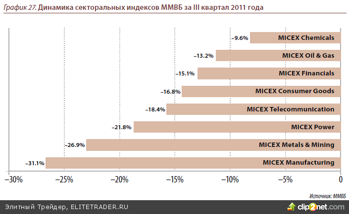На фоне падения российского фондового рынка в третьем квартале 2011 года аб- солютно все сектора продемонстрировали отрицательную динамику. Чуть лучше своих “коллег” смотрелись нефтегазовый и химический, снижение которых соста- вило “всего” 13.2% и -9.6 % соответственно. Заслуга в этом державшихся на высо- ком уровне нефтяных цен и показывавших неплохую динамику акций Уралкалия на фоне роста контрактных цен на хлористый калий (подробнее см. ниже в разде- ле “Минеральные удобрения”). Лидерами снижения на российском фондовом рын- ке из-за низкой ликвидности были металлургический(-26.9%), автомобилестроитель- ный (-31.1%) и энергетический(-21.8%) сектора, акции которых традиционно относят ко “второму эшелону” российского фондового рынка – он наиболее пострадал в ходе августовско-сентябрьских распродаж из-за низкой ликвидности.