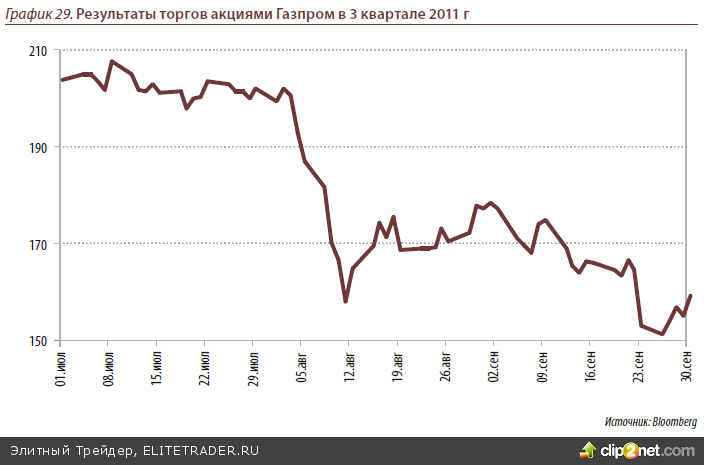 Затянувшийся боковик на мировых площадках был прерван. В начале августа и в конце сентября прошли два чувствительных снижения, в ходе которых фондовые индексы потеряли по 10-15% и опустились до уровней ноября-декабря 2010 года. Весь рост начала 2011 года был “съеден”. Первая часть снижения произошла 3-10 августа на фоне понижения рейтинга США агентством Standard & Poor’s, спорами между республиканцами и демократами по вопросу повышения планки государ- ственного долга США и опасениями, связанными с долговыми проблемами пери- ферийных стран Еврозоны. Вторая часть снижения прошла после заседания ФРС США (в очередной раз указавшего на слабость американской экономики и предло- жившего лишь проведение программы “Operation Twist” полувековой давности). Во время второй фазы падения формального “триггера”- сильнонегативной новости не было (какой в 2008 году, например, было банкротство американского банка Lehman Brothers), просто шли активные распродажи.