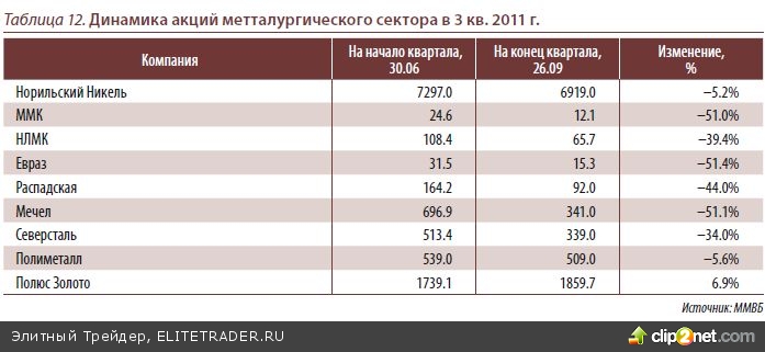 В 3 квартале металлургический сектор был одним из лидеров падения – отрасле- вые индексы RTS и MICEX потеряли 33% и 27%. Такая динамика металлургическо- го сектора связана с опасениями замедления темпов роста мировой экономики. Металлургический сектор традиционно наиболее чувствителен к подобным опасе- ниям и первым реагирует на негативные новости (т.к. в периоды кризиса в экономи- ке спрос на продукцию металлургии падает наиболее сильно). В лидерах падения в секторе оказались акции сталелитейных компаний – ММК, Евраз и Мечел к приме- ру потеряли 51% капитализации. Против ММК сыграли выросшие цены на метал- лургическое сырьё (коксующийся уголь и железную руду) – из-за недостаточности собственной ресурсной базы, компания частично закупает их на стороне, что уве- личивает её издержки и снижает рентабельность. Ещё одна причина слабости ак- ций ММК – слухи о возможном уходе с поста главы компании основного акционера Виктора Рашникова, что может ослабить позиции компании
