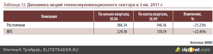 В центре внимания в 3 квартале продолжала находиться реформа холдин- га Связьинвест, вышедшая на финишную прямую. Напомним, в апреле обыкно- венные и привилегированные акции семи межрегиональных компаний холдинга «Связьинвест» и «Дагсвязьинформа» были конвертированы в 16 выпусков акций Ростелекома. В середине августа 17 различных выпусков акций Ростелекома были объединены. После объединения возрос объём торгов на ММВБ (по обороту акции Ростелекома входили в TOP-5). 17 августа агентство MSCI объявило о включении обыкновенных акций Ростелекома с 1 сентября в расчёт индекса MSCI, на который ориентируются зарубежные фонды при составлении своих портфелей. После объяв- ления о включении Ростелекома в индекс MSCI акции компании заметно выросли. Правда, распродажи на российском рынке в 3 квартале сказались и на котировках Ростелкома(-21% за 3 месяца).