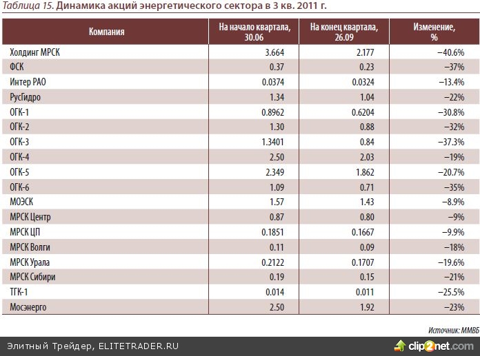 В 3 квартале энергетический сектор был одним из лидеров падения – в ходе авгу- стовской коррекции отраслевой индекс снизился на 22%. На наш взгляд, сниже- ние носило технический фактор и наиболее сильно пострадали менее ликвидные акции второго эшелона, к которым относятся и бумаги энергетического сектора. Привлекательность сектора низка также из-за высокого уровня износа сетей и гене- раций, а также небольшой вероятности повышения тарифов на электроэнергию до выборов президента России в 2012 году