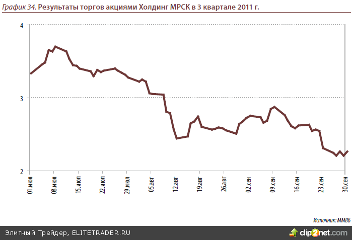 После сильного снижения (-41% в 3 квартале) привлекательно выглядят акции хол- динга МРСК – её капитализация составляет всего 30% от стоимости чистых акти- вов. На котировки акций холдинга давит госрегулирование тарифов, что снижает рентабельность. После президентских выборов 2012 года вероятен переход на ры- ночное регулирование тарифов, что должно позитивно сказаться на финансовых по- казателях компании. Кроме того, возможно в будущем акции холдинга МРСК всё- таки включат в расчёт индекса MSCI Russia