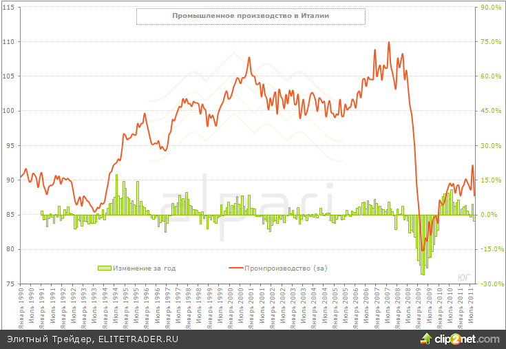Вместе с немецкой и французской промышленностью в сентябре были и итальянцы. За месяц производство сократилось здесь на 4.8%, хотя здесь стоит делать скидку на августовский рост, который составлял 3.9%, это был локальный всплеск. Годовое сокращение производства составило 2.7%, но в целом производство стагнирует уже более года без наличия ярко выраженной тенденции. За квартал производство сократилось на 0.2%. В кризис итальянская промышленность провалилась очень сильно, падение достигало 27.4%, восстановиться производство после этого так и не может, на данный момент объемы производства остаются на 20.2% ниже докризисного максимума, т.е. восстановить на данный момент удалось около 1/4 кризисных потерь и пока нет признаков того, что здесь будет присутствовать позитивная тенденция.