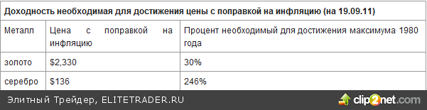 Исходя из показателей индекса потребительской инфляции (CPI), золото находится в паре прыжков от достижения своего максимума в $850 от 1980 года. У серебра куда более интересные перспективы и оно дало бы в три раза больше сегодняшнего уровня, если бы достигло своего прошлого пика.