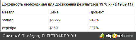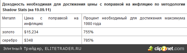 Текущая коррекция может продолжиться, и мы можем рассчитывать на ее повторения и дальше. Но данные говорят, что потенциал для роста у золота и серебра куда больше, и их не собьет с пути кратковременные колебания на рынке 22 сентября 2011 Золото торгуется совсем рядом с $2,000, уже выросло на 27% с начала года и инвесторы вполне могут поинтересоваться насколько еще могут вырасти драгоценные металлы. Ведь золото приближается к своему максимуму с поправкой на инфляцию 1980 года, а это был зубец, просуществовавший лишь один день.