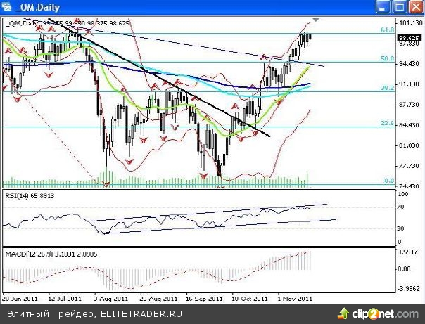 РЫНОК НЕФТИ По данным от американского института нефти (API), опубликованным сегодня, запасы сырой нефти на прошлой неделе выросли на 1,302 млн. баррелей, запасы бензина и дизельного топлива и топочного мазута упали на 2,940 млн. баррелей и 2,562 млн. баррелей соответственно. Сегодня в 19:30 МСК в США выйдут данные о динамике коммерческих запасов нефти и нефтепродуктов за неделю, завершившуюся 11 ноября. На предшествовавшей неделе коммерческие запасы сырой нефти понизились на 1,4 млн баррелей. Техническая картина на рынке нефти, по-моему, выглядит следующим образом: во-первых, цены на нефть марки Light достигли 61,8% уровня коррекции с 114,75 до 74,875$. Данный уровень является определяющим, его прохождение может открыть дорогу в район годовых максимумов, а его удержание привести к коррекции как минимум в район 94-95$ за баррель. Во-вторых, на дневном графике нефти марки Light вчера образовалась свечная модель «пинцет без подтверждения», в случае закрытия сегодняшнего дня черным «телом», мы получим подтверждение, а это значит, что снижение продолжится. К тому же даже осциллятор RSI встретил сопротивление у верхней границы существующего канала