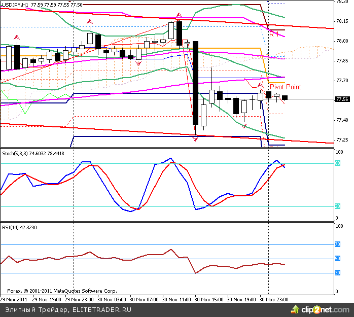 Технически USD/JPY торгуется в нисходящем канале на часовом таймфрейме. Верхняя граница (сопротивление) проходит около 78.11, нижняя - около 77.24.
