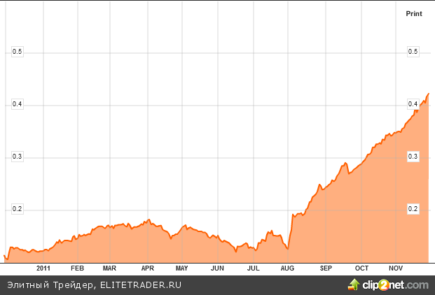 За последний год спрэд устойчиво растет, достигая 40 базисных пунктов или 0.4%, хотя это значительно ниже пика кризиса 2008, когда было 3.5%.