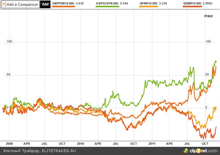 И что видим? Ниже сравнение 10 летних бондов, где конец ноября 2008 принят за 0. Зеленая линия (Испания), оранжевая (Италия), желтая (Великобритания), красная (США).