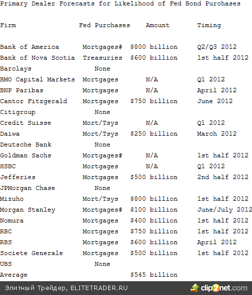 Наши друзья - первичные дилеры совсем с цепи сорвались )) Конечно, это тоже было предсказуемо примерно на 99% Wall St никогда не откажется от дополнительного вливания ден.знаков, даже в электронном обличи. Фактически все готово. Дадли и Бернанке запустят QE как только, так сразу. Пока ожидают снижения темпов M2 и инфляции. Но электронная типография пылится и ждет своего запуска. Дилеры ожидают 500-600 млрд QE3, запуск которого может начаться в первой половине 2012. Я его тоже жду где-то в марте-апреле 2012. Там рынки могут опустить ниже 1000 пунктов по S&P