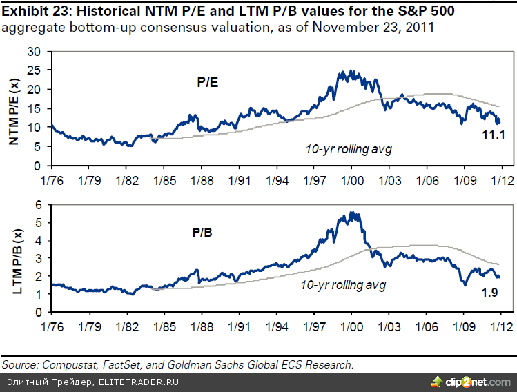 Простой пример, в середине 2002 года многие аналитики говорили, что рынок не может стоить ниже 10 летнего среднего уровня p/e, т.к. в историческом плане он всегда стоил выше, по крайней мере с 70-х годов, но по факту, мы уже 10 лет ниже этого среднего уровня. При S&P 1160, если брать за основу P/E и P/B, то рынок уже стоит меньше, чем в мае-июле 2010 при S&P 1050-1070. Т.е. в данный момент если рынок опустится опять ниже 1100, то это не тоже самое, что в 2010 аналогичный уровень. И если в 2010 году 1200-1250 по индексу можно было считать, что несколько дорого, то в 2011 это скорее дешево. Компании не стоят на месте, а показывают рекордные прибыли.