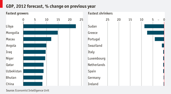 По данным Economist Intelligence Unit, ливийская экономика будет расти быстрее других в 2012, получив импульс после свержения режима Каддафи. Всплеск поможет оправиться от спада во время ведения войны. В Ираке послевоенный хаос отсрочил восстановление, но 2012 год может стать новым этапом. Монголия переживает бум добычи, и будет получать дивиденды от инвестиций в этот сектор; Ангола и Нигер получат выгоду от относительно высоких цен на сырье