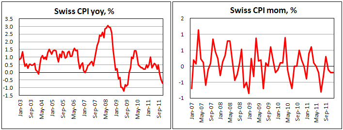 Несмотря на заверения главы НБШ Хильдебранда, что это временно, дефляция в Швейцарии продолжает углубляться. Согласно опубликованным сегодня данным, потребительские цены упали в декабре еще на 0,2%, что стало седьмым снижением за последние семь месяцев. Во втором полугодии годовой темп падения цен составлял 2,4%, что просто обязано вызвать тревогу у швейцарских политиков. На квартальном заседании в прошлом месяце НБШ упустил возможность поднять целевой уровень с 1,2 по EUR/CHF, несмотря на настойчивые мольбы экспортеров, которые утверждают, что валюта остается крайне переоцененной. В эти дни перед НБШ стоит нелегкая задача: в наши дни евро трудно назвать устойчивой валютой, а сохранение обязательств неограниченных покупок единой валюты повышает риск подрыва доверия к банку, не говоря уже о «акционерах» НБШ. Кроме того, похоже, что экономика стоит перед рецессией в этом году и разгорающейся дефляцией. Как предположил Хильдебранд в прошлом месяце, НБШ продолжает работу в «непрерывном кризисном режиме». И делает он это уже более четырех лет
