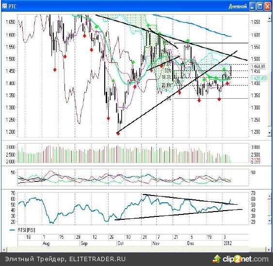 В нашем случае, учитывая, что до консолидации индексы все- таки росли несколько дней, я склоняюсь к варианту, что она образована не в начале восходящего движения, а это значит, что локальные максимумы где-то рядом. И когда они отчетливо проявятся, то от них лично я буду готовиться играть вниз с целью закрытия новогодних «гэпов». И хотя я неоднократно указываю данные уровни, я все же повторю, что у индекса ММВБ «гэп» расположился на уровне 1402,02-1403,56 пунктов, а у индекса РТС на уровне 1380,49-1386,21 пунктов