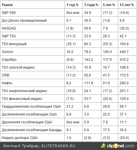 Ясно видно, что в текущем столетии доминируют золото, энергоресурсы и сырьевые товары. По прошествии 12 лет фондовые рынки США остаются в основном на отрицательной территории, хотя канадский TSX несколько вырос благодаря заметному присутствию золотых, энергоресурсных и товарных компонентов. Канадские финансовые акции показали хорошие результаты, тогда как американские терпят бедствие, потеряв 48,1% с 1 января 2000 года (по данным банковского индекса PHLX KBW). Облигации оставались тихой гаванью с устойчивыми, но не впечатляющими результатами.