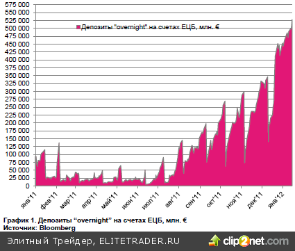 Возвращаясь в 21 декабря 2011 г. – день, когда ЕЦБ провел операцию по предоставлению неограниченных 3-летних кредитов (LTRO – Long Term Repurchasing Operation) и предоставил банкам €489 млрд. евро под 1% годовых (ввиду действия перекрестных операций банкам в чистом виде досталось около €210 млрд.) – депозиты “overnight” по ставке 0,25% годовых составляли €265 млрд. Во вторник, 17 января 2012 г., депозиты европейских коммерческих банков на счетах ЦБ составили рекордные за всю историю €528 млрд. Таким образом, с того знаменательного дня депозиты на счетах ЕЦБ выросли на €263 млрд., что существенно превышает полученные в рамках LTRO банками €210 млрд. Почему свободная ликвидность уходит на депозиты?