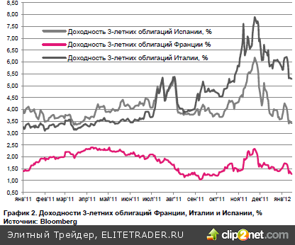 Сегодня с уверенностью можно сказать, что план “Супер Марио” работает – доходности, к примеру, 3-летних облигации по Франции, Италии и Испании значительно снизились за прошедший месяц. Это значит, что цены выросли и банки, держащие на своих балансах такие бумаги, смогли немного заработать. Более того, многочисленные январские европейские аукционы по размещению долговых бумаг с короткой дюрацией проходят достаточно успешно