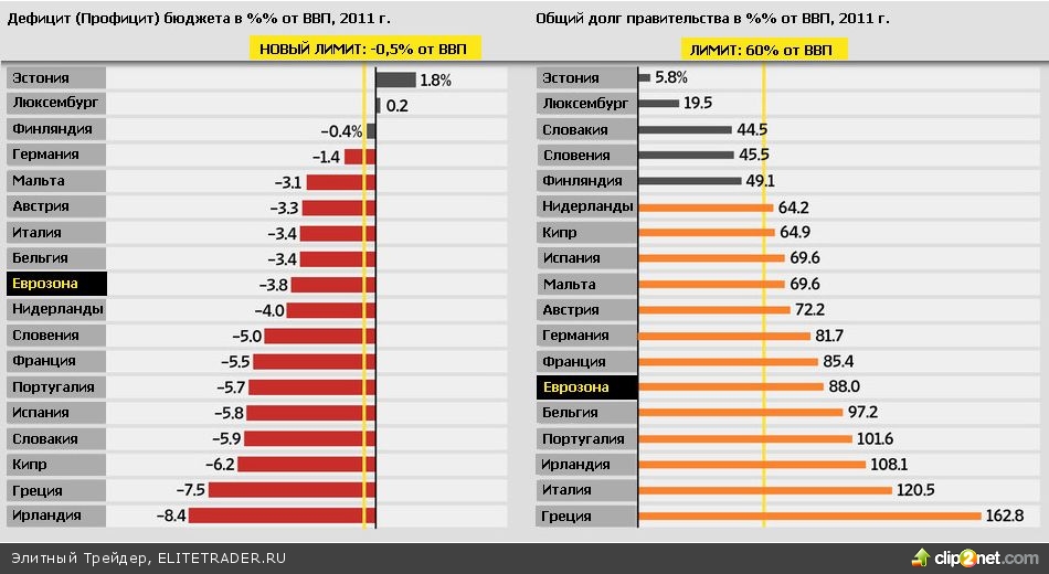 Подписанный в понедельник фискальный пакт, подразумевающий пожертвования Германии в «стабилизационный» фонд, накладывает довольно жесткие бюджетные нормы на всех членов ЕС, что, как предполагается, поможет избежать греческих долговых сценариев в будущем. «Учитывая жесткие временные рамки, подписание пакта можно рассматривать как настоящее достижение», - заявила канцлер Германии Ангела Меркель (обсуждение пакта началось лишь в декабре 2011 г.).