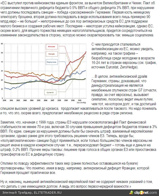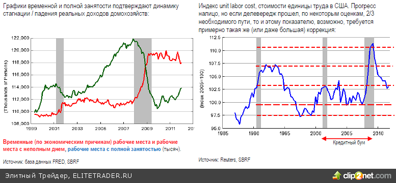 Нет сомнения, что зеленые ростки в глобальной экономике видны все яснее, хотя и сквозь все еще толстый слой льда: это – еще только набирающий разбег бум новой энергетики (сланцевые ресурсы) и энергосбережения (гибридные и электромобили), это прохождение США через делевередж, несмотря на все контрусилия монетарных властей и т.п. Но люди не могут отрешиться от груза старого: тяжело терять незаработанные блага… В Греции, например, возникла перспектива новой 24-часовой всеобщей забастовки, и это не удивительно: чтобы вернуть конкурентоспособность, работающим грекам придется потерять свыше трети доходов и льгот (стоимость unitlabor в Греции на 30% выше немецкой величины).
