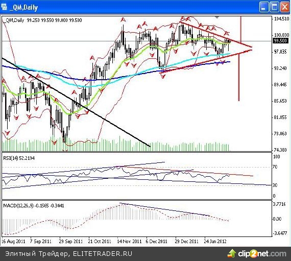 РЫНОК НЕФТИ В пятницу я взглянула на дневной график нефти марки Light по-другому и обнаружила, что на нем формируется фигура «треугольник». Первая заходящая в «треугольник» волна высотой 11,2$, а это значит, что потенциал выхода из фигуры равен порядка 10-11%. В случае пробой верхней границы фигуры и пробоя ближайшего фрактала на покупку, находящегося на 100,10$ за баррель, можно будет констатировать выход наверх из образованного «треугольника». Однако пробоя линии поддержки фигуры и пробой ближайшего дневного фрактала на продажу, расположенного на уровне 95,75$ за баррель, включит сценарий снижения