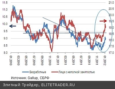 В США вновь вышли неплохие данные по экономике, которые вписываются в общую относительно благополучную картину: первоначальные требования страховки по безработице упали вновь, уже к 350 тыс. в неделю, индекс PhillyFed оказался, как и многие из других недавно опубликованных региональных индексов, несколько выше ожиданий, улучшились показатели нового строительства (правда, очень волатильные – особенно, если принимать во внимание необычно теплую погоду в США в январе и феврале). На фоне улучшения состояния занятости стратегия riskon имеет четкое обоснование. Но и тут не обходится без странностей. Вот данные по безработице от Gallup. Они оказываются несколько альтернативными, и коррелируют скорее с данными по снижению мировой внешней торговли, а также со снижающейся динамикой потребления бензина и электричества в США, которую мы продемонстрировали в нашей вчерашней презентации «По знакомому кругу или Черное и белое.»