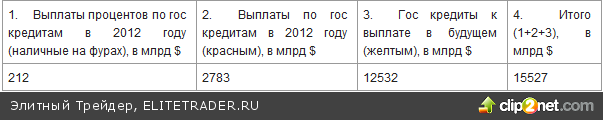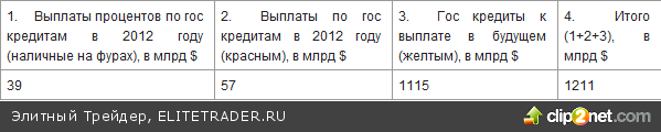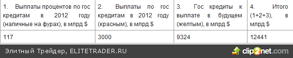 США взяли взаймы $1229 млрд в 2011 году - примерно 2,5 башни наличных на заднем плане. Размер дефицита бюджета США – около 35%, что значительно превышает уровень в 3%, установленный ЕС в качестве границы экономической стабильности. Промышленно развитые странах мира находятся в кризисе и у США нет проблем с рефинансированием дефицита бюджета в 2012 году, так как деньги всего мира в данный момент притекают в США в больших количествах. Инвесторы пытаются найти «тихую гавань» для своих денег, так как Европа и банки не являются безопасными. До тех пор, пока США имеют доступ к дешевым кредитам из-за страха инвесторов, желающих отдать свои деньги в целях «безопасности», размер процентных платежей США будет оставаться намного ниже нормы. На февраль 2012 года долги США структурированы так: