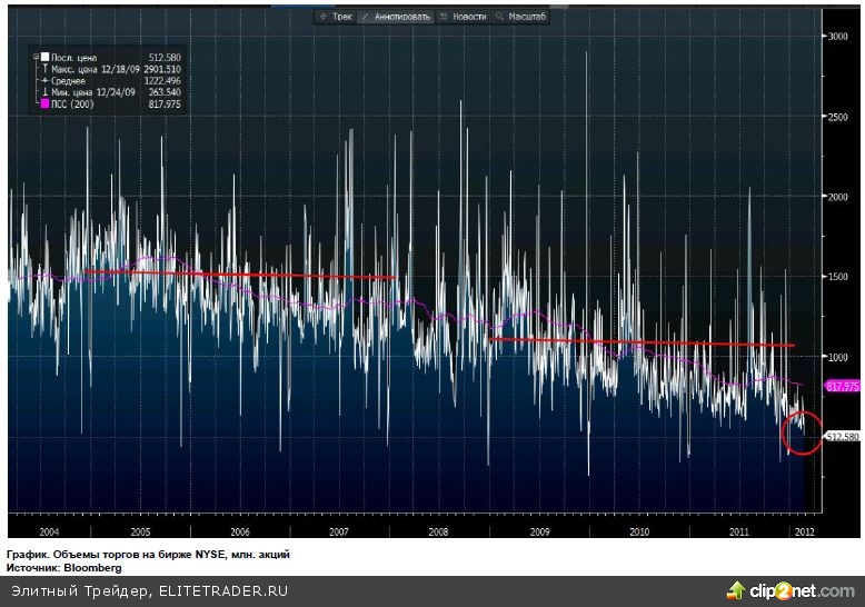 В пятницу индекс Dow Jones достиг нового многолетнего максимума, а объемы торгов на бирже NYSE и по ES (e-mini фьючерс на индекс S&P 500) обновили свои минимумы. Речь идет об американских торгах без учета праздничных дней, когда объемы низкие априори. Судя по всему, в прошлую пятницу объем торгов был минимальным с середины 2009 года. А в целом объемы торгов на NYSE упали примерно на 50% по отношению к средней 2004-2007 годов!
