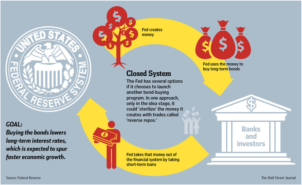 В соответствии с новым подходом, ФРС будет печатать новые деньги, для выкупа долгосрочных ипотечных и казначейских облигаций, и сразу же привлекать потраченные деньги на краткосрочные депозиты под низкий процент. Цель такого подхода в том, чтобы снять опасения критиков о том, что печатный станок в очередной раз простимулирует не экономику, а инфляцию.
