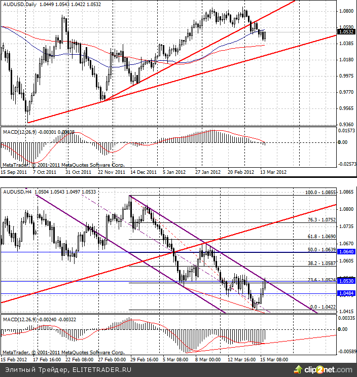 Далее, если день закрывается выше открытия предыдущего дня, это означает смену направления в сторону роста. На графике Н4 рост подтверждает дивергенция между ценой и индикатором MACD. Росту препятствует сопротивление $1,0855-$1,0663. Покупку стоит планировать в случае пробития сопротивления - на откате приблизительно к уровню 1,0530 (по скоплению цен). Stop loss вынести ниже 1,0484 (минимум среды). Цель - уровень 1,0630 - область уровня 50% коррекции Фибо от падения $1,0855-$1,0422. Продажи на этой неделе пока не стоит планировать.