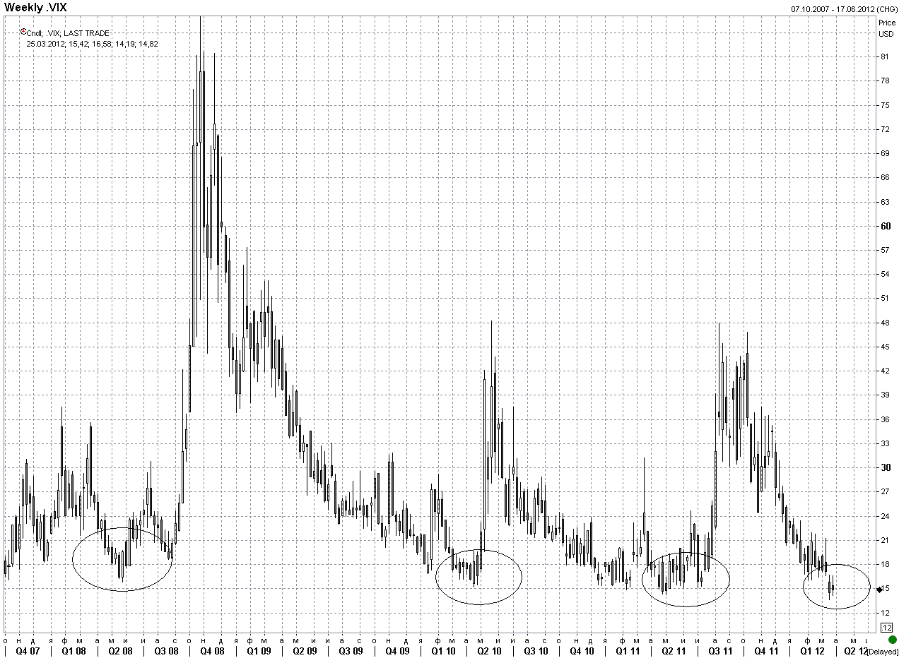 Но так или иначе, с ретестом максимумов или нет, но в среднесрочной перспективе восходящий тренд должен надломиться (тут я конечно Америку не открываю). Индекс VIX вновь опустился к минимальным уровням последних месяцев. Этот индекс основан на волатильности опционов на S&P 500 и упоминается как «мера страха инвесторов», поскольку его значение имеет тенденцию резко возрастать, когда рынки находятся в условиях стресса. Однако в данный момент его значение 14,8 - это ниже, чем было во втором квартале 2008 года, когда на большинстве мировых рынков были показаны существенные максимумы перед началом кризиса. То есть страх на рынке сейчас фактически отсутствует, а именно в такие моменты очень часто происходят резкие развороты рынка и начало мощных движений.