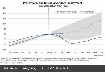 В секторе профессиональных и бизнес услуг, которые зафиксировали крупнейший среднемесячный рост в текущем восстановлении, количество рабочих мест все еще на 2.7% ниже уровня начала прошлого спада, как показывает график ниже.